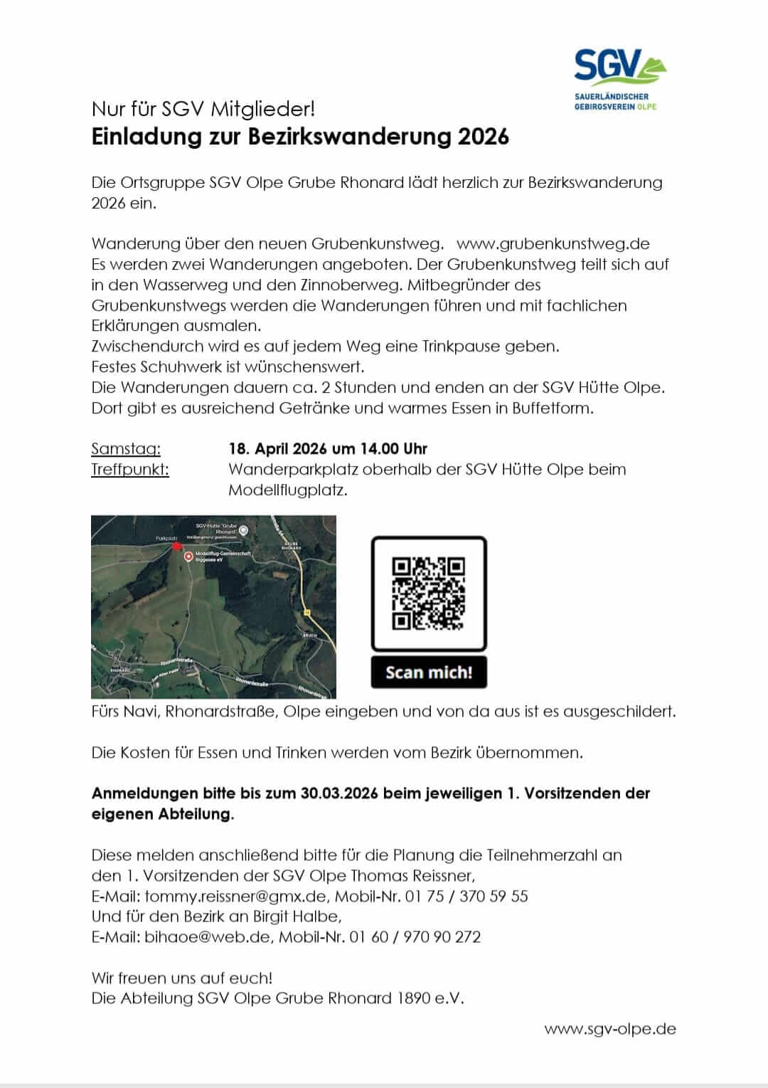 Teilnahme nur für SGV-Mitglieder. Eine Anmeldung ist bis 30.03.2026 über unsere Vereinsvorsitzenden erforderlich. Telefon: 0160 93829010 oder E-Mail an vorstand@sgv-drolshagen.de
